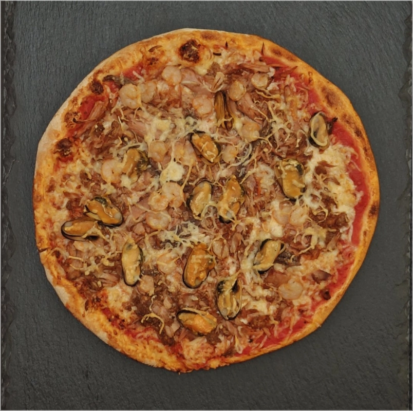 Tomatensaus, kaas, tonijn, mosselen, garnalen en ansjovis