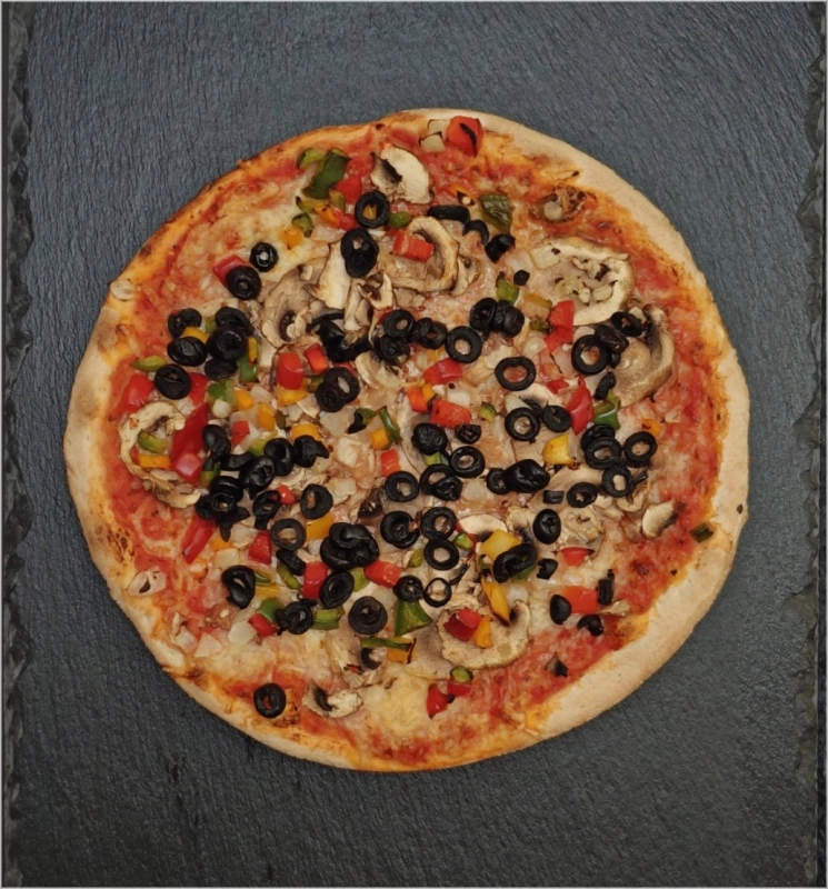 Tomatensaus, kaas, champignons, uien, paprika, olijven en pepertjes