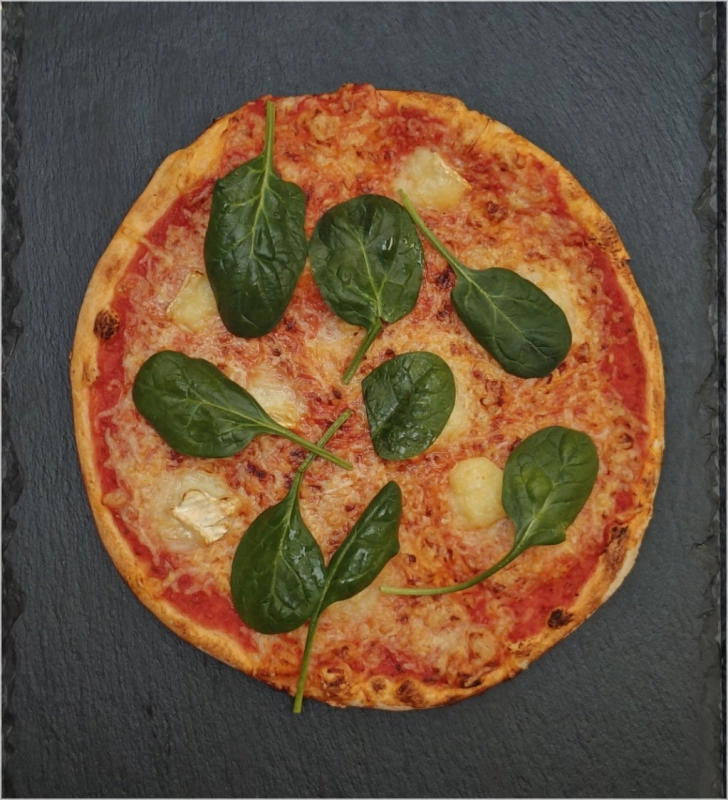 Tomatensaus, kaas, brie en verse spinazie